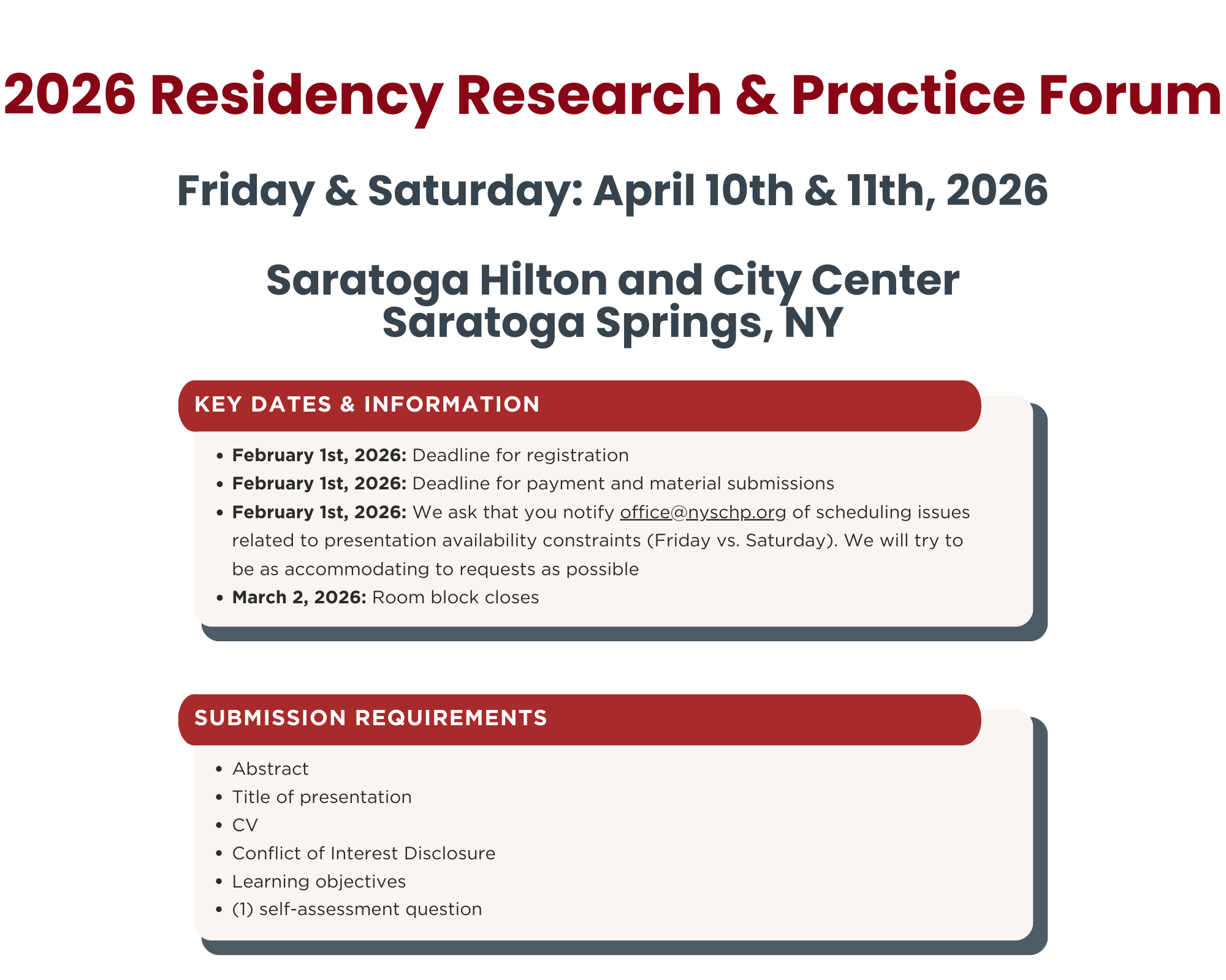 - We ask that you notify [email protected] of scheduling issues related to presentation availability constraints (Friday vs. Saturday) by no later than February 1st. We will try to be as accommodating to requests as possible.
